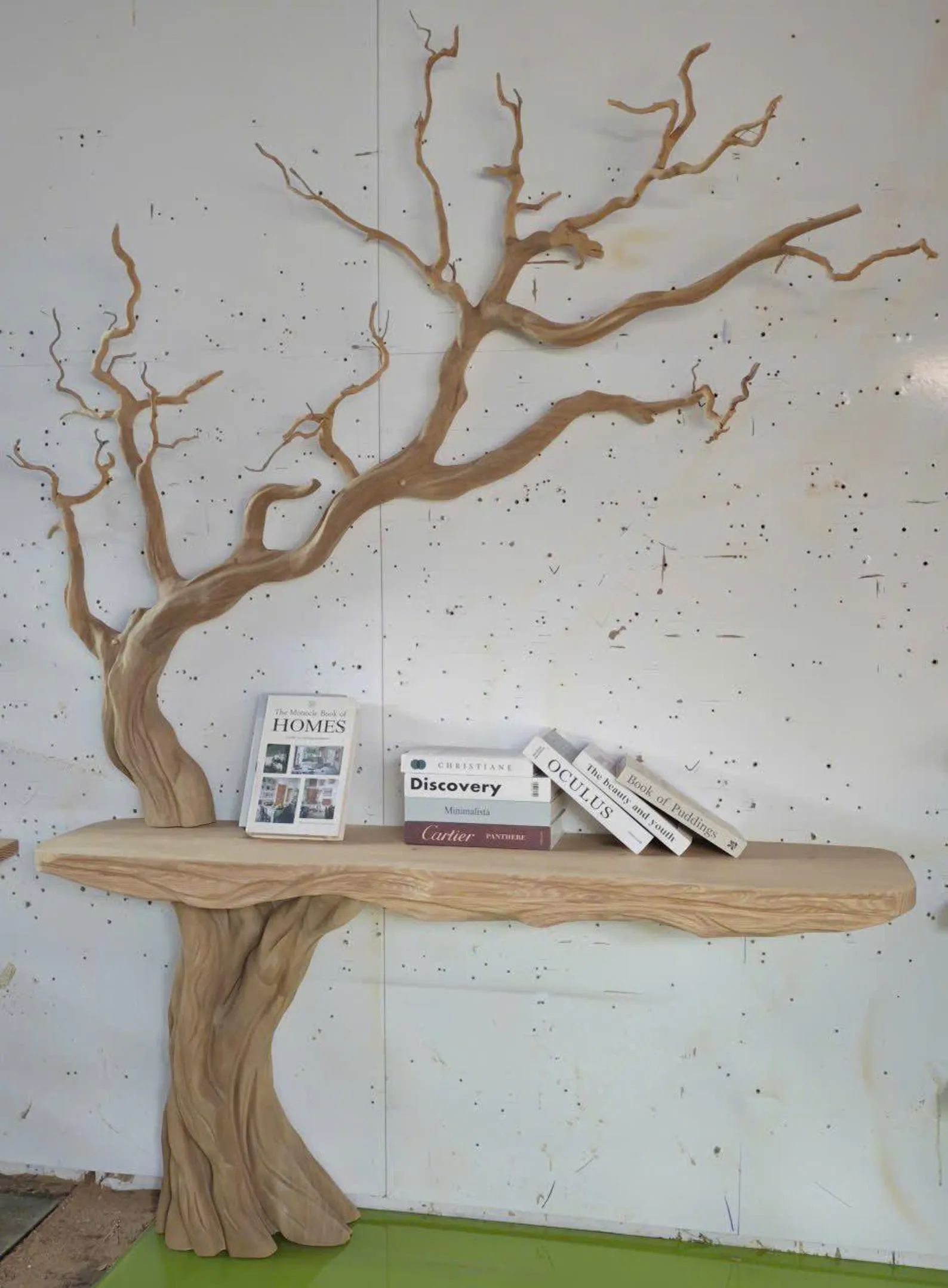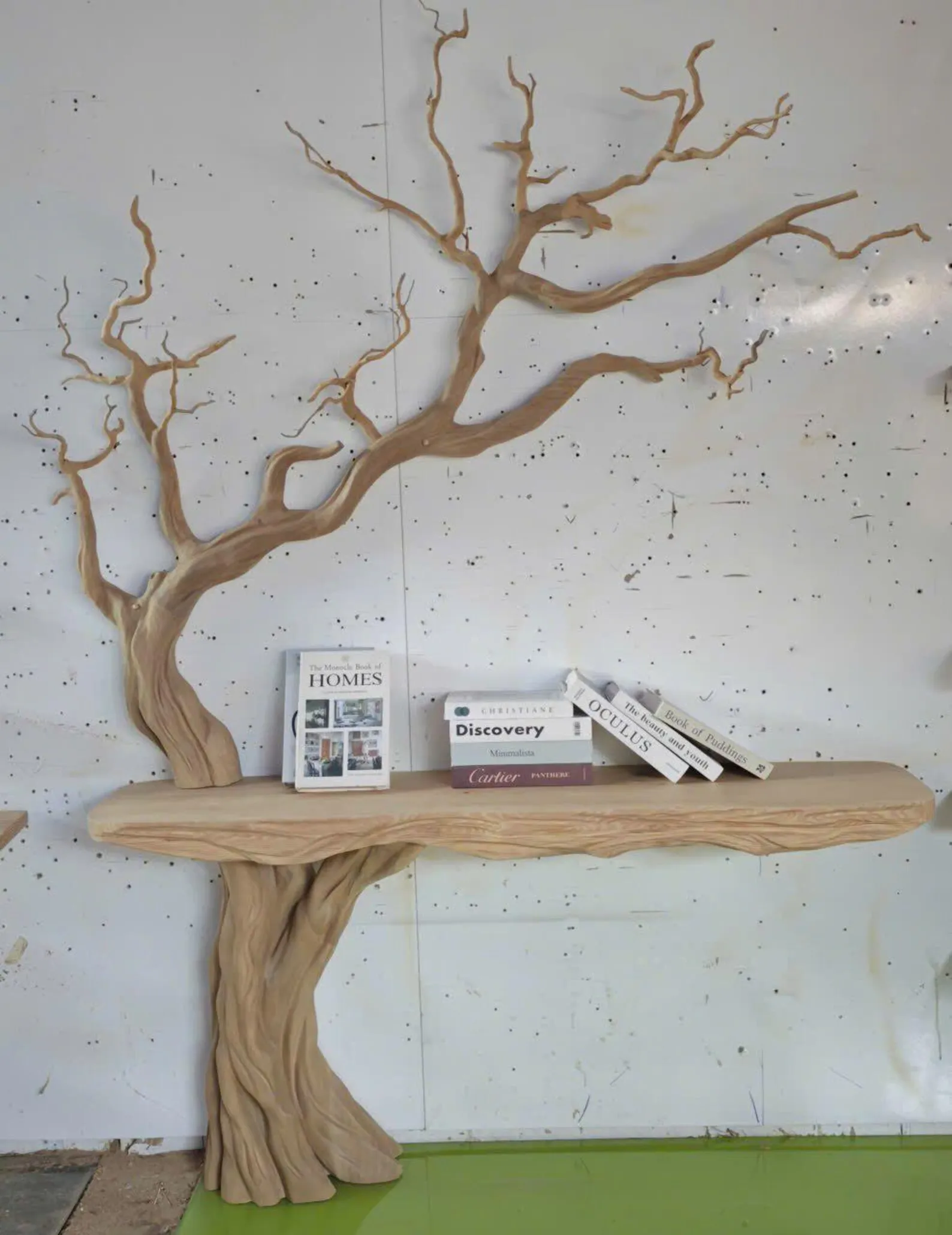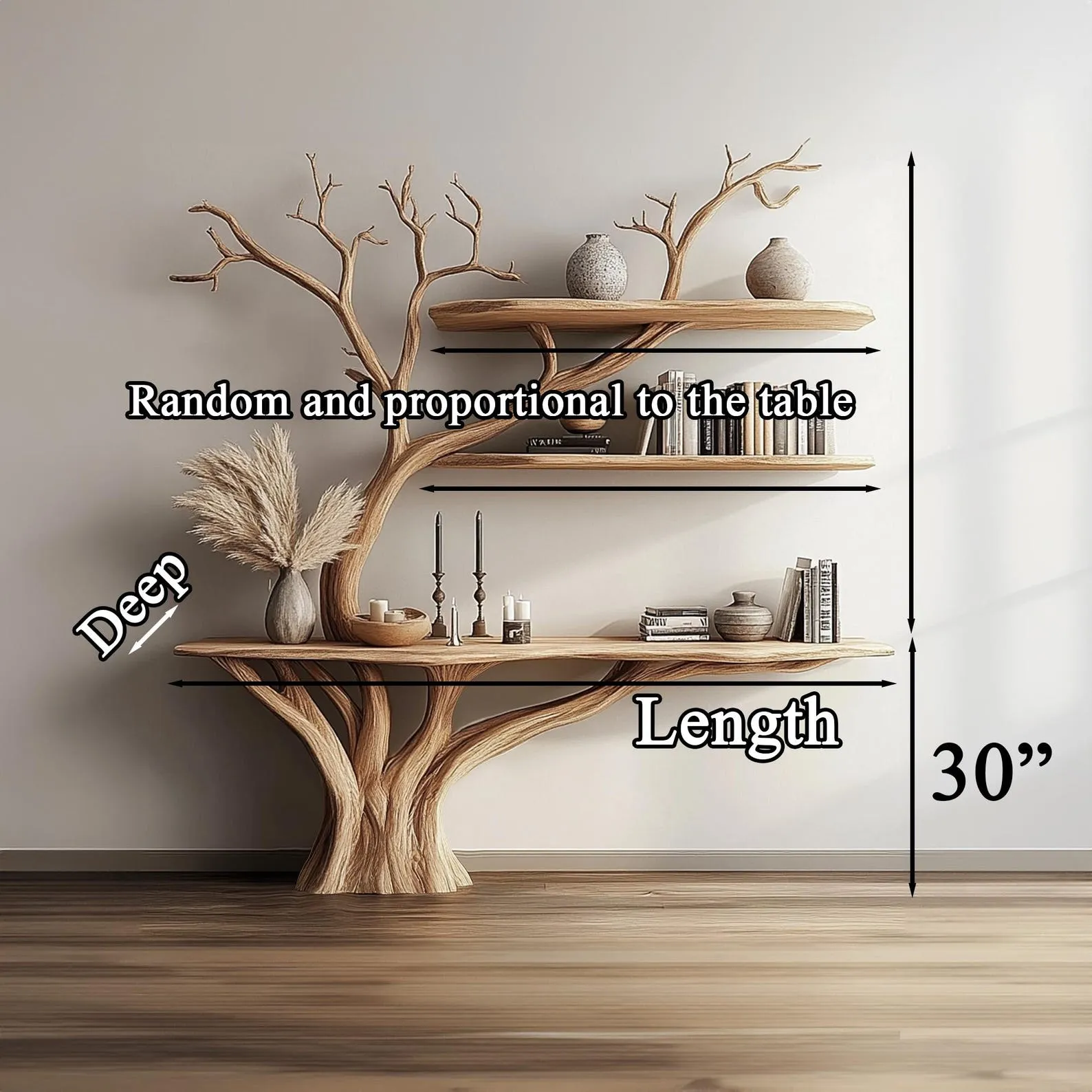 This narrow console table with tree-shaped bookshelf wall unit combines a slim surface with vertical display, making it ideal for hallways, living rooms, or family spaces that need organization without bulk. The console top works as a tidy landing zone for small items, while the tree-shaped bookshelf adds a decorative, sculptural element for books and light décor. The tree form also helps the piece feel intentional even when lightly styled—one or two book stacks and a small plant can look complete. For a balanced display, mix vertical books with a few horizontal stacks, and leave negative space so the silhouette remains clear. In family areas, use the console surface for baskets or bins to keep daily clutter contained. Styling tip: warm neutrals and natural textures complement the tree theme; matte ceramics and soft lighting keep it calm. Care: dust regularly, wipe gently with a soft cloth, and avoid harsh chemical cleaners. Distribute items evenly and keep heavier objects lower to support stable organization. The image set provides placement inspiration and shows how the tree profile interacts with books from different angles. This is a strong option for creating a functional reading-and-storage wall that still looks like décor.